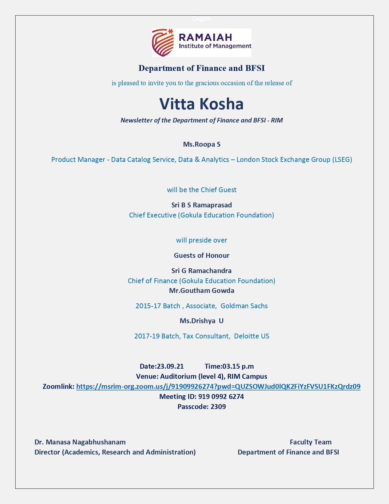 Department of Finance and BFSI (MSRIM) brought out its #studentnewsletter Vitta Kosha with the tagline ‘of the students, for the students and by the students on 23.09.21 marks an attempt of sharing knowledge, news and thoughts about #finance #economy #banking, #financialservices and #insurancesectors. This exercise is supported and guided by our faculty who have expertise in finance, economics and allied areas. The #newsletter intends to provide a platform to the students and alumni to share insights from their experience and exposure and at the same time be connected to the #Institute. Ms. Roopa S Product Manager – Data Catalog Service, Data & Analytics – London Stock Exchange Group (LSEG) graced the occasion as chief guest. Ms Roopa shared insights from her vast experience and exposure. Director Dr. Manasa Nagabhushanam, highlighted the importance of involving alumni in the Institute activities. Chief of Finance (GEF) Sri Ramachandra appreciated the efforts of the Department and mentioned that all the alumni right from the first batch of the Institute should be encouraged to associate with the Institute. The occasion was also graced by Mr. Gautham Gowda, Associate Goldman Sachs Alumnus and Ms. Drishya U, Tax consultant, Deloitte US alumna.