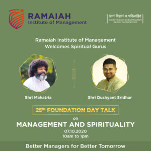 RIM is celebrating 25th Foundation day on 7th October, 2020. On this occasion, two eminent spiritual gurus of our time Shri Mahatria Ra and Shri Dushyanth Sridhar will speak on Management and Spirituality. The event is scheduled from 9.30 am to 1.00 pm
