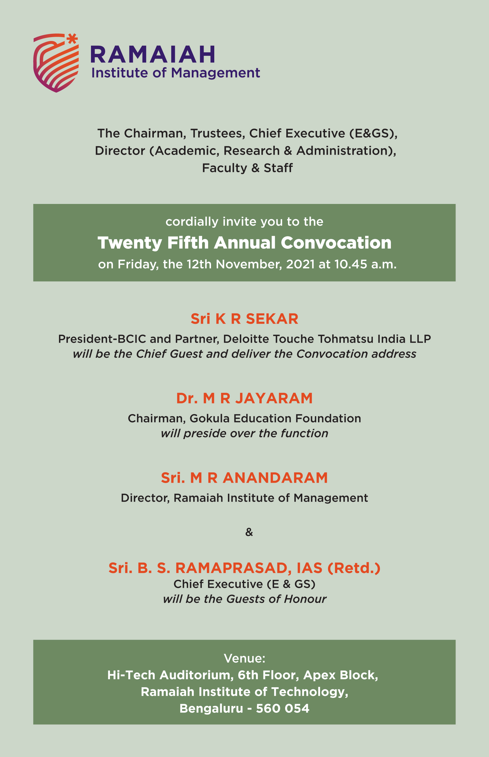 MSRIM is pleased to announce that the Convocation Ceremony for the graduating Batch of 2019-21 has been scheduled on 12th November 2021. Mr. K R Sekar, President – BCIC & Partner, Deloitte Touche Tohmastu India LLP, Chief Guest for the Twenty fifth Annual Convocation, will deliver the Convocation address. Merit certificates for Academic and Non-Academic excellence will also be given out during this occasion.